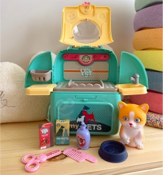 Una volta aperto, diventa una stazione di gioco con lavello, rubinetto, ripiani e ganci per gli accessori. I bambini possono fare il bagnetto alla gattina, pettinarla e nutrirla, vivendo situazioni realistiche.