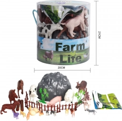 - figurine di animali da fattoria, recinto, rocce, piante, tappetino da gioco, mappa tematica, secchio/box portaoggetti