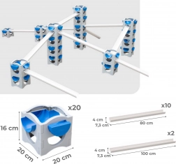 Combina tubi bianchi e blocchi blu‑grigi per creare percorsi d’acqua personalizzati – da scivoli semplici a cascate complesse.
