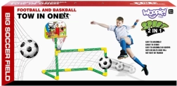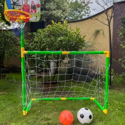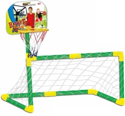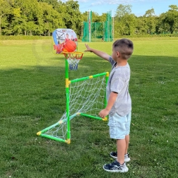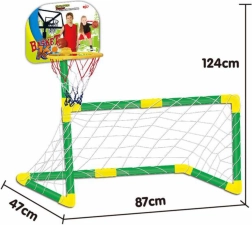 Contenuto della confezione: porta da calcio con rete, canestro da basket, pallone da calcio, pallone da basket, piccola pompetta.