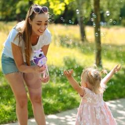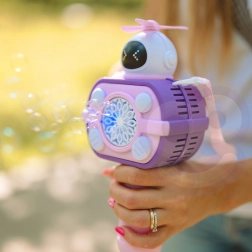 Nel pacchetto sono inclusi due contenitori per il liquido delle bolle e un cinturino, consentendo al bambino di appendere il giocattolo al collo e creare bolle passeggiando senza la necessità di premere un pulsante. Gli effetti luminosi e la facilità di utilizzo aumentano l'attrattiva di questo giocattolo.