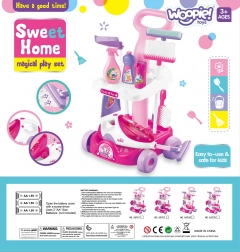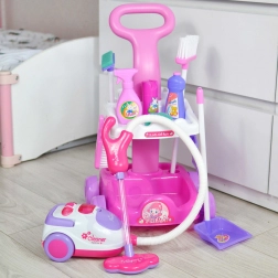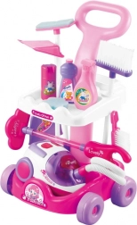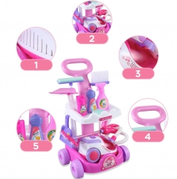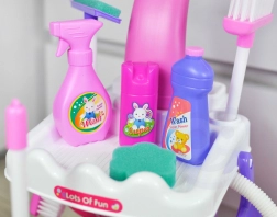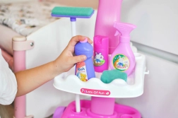 Il set include tutto il necessario per un gioco fantasioso: dal carrello con manico e supporti a spazzole, mop, palette e “detergenti”. La struttura sicura e il peso ridotto garantiscono un uso confortevole anche per i più piccoli.