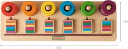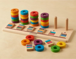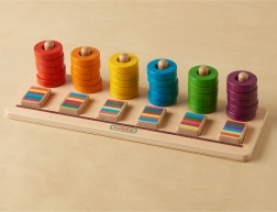 Questa tavola educativa è un puzzle perfetto per bambini dai 2 anni. Il set include 30 anelli colorati (6 set da 5 pezzi in colori simili), utilizzabili per gioco, apprendimento dei colori, classificazione e sequenziamento. I bambini possono disporre gli anelli in un ordine prestabilito oppure creare le proprie sequenze. Gli spazi davanti ai pioli permettono di comporre blocchi di sequenze, offrendo una sfida che sviluppa concentrazione, consapevolezza spaziale, pensiero logico e capacità di riconoscimento dei colori.