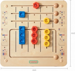 Questo pannello educativo è progettato per favorire il riconoscimento delle forme e la motricità fine. È diviso in due parti: la parte superiore contiene una fascia con il compito, in cui i bambini devono posizionare tre forme (esagono rosso, quadrato blu e cerchio giallo) nei punti corretti. La parte inferiore del pannello presenta tre colonne con 9 forme che i bambini devono abbinare correttamente per colore e forma. Gli elementi sono collocati in modo da poter essere spostati facilmente senza poterli perdere. Il pannello può essere usato su un tavolo oppure fissato alla parete.