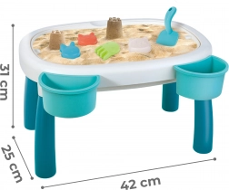 La confezione include 7 pratici accessori – annaffiatoio, paletta, 4 formine (tricheco, gatto, panda, coniglietto) e due vaschette per il tavolino. Grazie a questi i bambini possono creare costruzioni di sabbia, versare l’acqua e sviluppare creatività e abilità manuali.