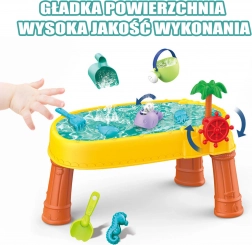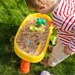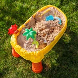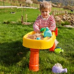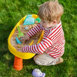 La confezione include 8 pratici accessori – formine, pesciolino, annaffiatoio, contenitore con manico, rastrello e paletta – che incoraggiano creatività, motricità fine e collaborazione tra i bambini. Il tavolino è leggero, facile da montare e da pulire, perfetto per il gioco quotidiano in casa e all’aperto.