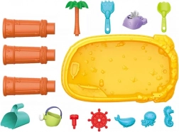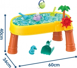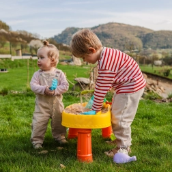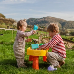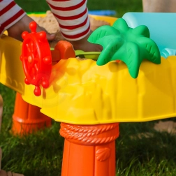 Il tavolino WOOPIE per acqua e sabbia è ideale per esperimenti sensoriali con acqua e sabbia. Grazie alla struttura stabile e agli accessori colorati, i bambini si divertiranno per ore in giardino, sul balcone e anche nella cameretta. Il timone pirata aggiunge una storia al gioco e stimola la fantasia.