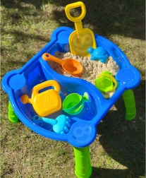 Le pratiche vasche doppie consentono un gioco pulito senza mescolare acqua e sabbia. I bambini possono contemporaneamente raccogliere, travasare e modellare.