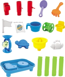 Contiene tutti gli strumenti necessari per un gioco creativo con sabbia e acqua - formine, rastrelli, palette e altro.