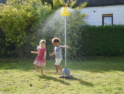 Il cappello dell'irrigatore spruzza acqua, creando un effetto visivo spettacolare e garantendo freschezza anche nei giorni più caldi.
