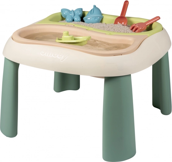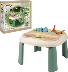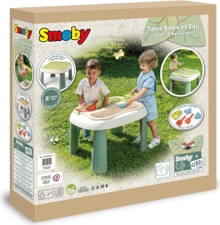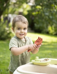 dai 18 mesi. Grazie a due vasche estraibili, i bambini possono giocare contemporaneamente con sabbia e acqua, sviluppando creatività e sensi. Questo tavolino offre un grande divertimento all’aperto, unendo ecologia e resistenza e portando tanta gioia ai più piccoli. Scelta perfetta per giardino, balcone o terrazza!