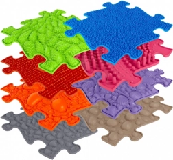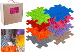 Il tappetino ortopedico sensoriale assemblato come un puzzle presenta superfici con diverse durezze e strutture che si completano perfettamente. Elementi duri come coni e conchiglie stimolano e rafforzano l'arcata del piede, mentre pietre più grandi aiutano a sforzare i muscoli del piede e a allenare la percezione di diverse superfici. Superfici morbide come erba e onde oceaniche servono come preparazione o rilassamento.