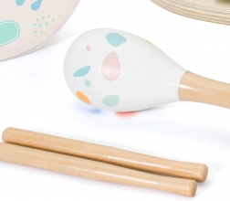 Questo set include cinque diversi strumenti musicali che si adattano perfettamente alle piccole mani dei bambini. Ogni strumento è realizzato in legno di qualità e dipinto con colori atossici, sicuri per i bambini e per l'ambiente.