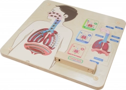 La lavagna didattica interattiva mostra il percorso dell'aria nel corpo e include illustrazioni realistiche del sistema respiratorio con effetti di diodi luminosi.