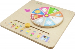 Grazie alla ruota girevole e al cursore sulla lavagna, i bambini possono conoscere diverse condizioni meteorologiche e cosa è appropriato indossare in tali condizioni.