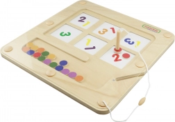 Giocattolo educativo in legno per bambini che unisce il conteggio e i colori in un divertente labirinto. Con l'aiuto di una bacchetta magnetica i bambini spostano i gettoni colorati e li inseriscono nei numeri corretti. Favorisce la motricità fine, il riconoscimento dei colori e il pensiero logico.