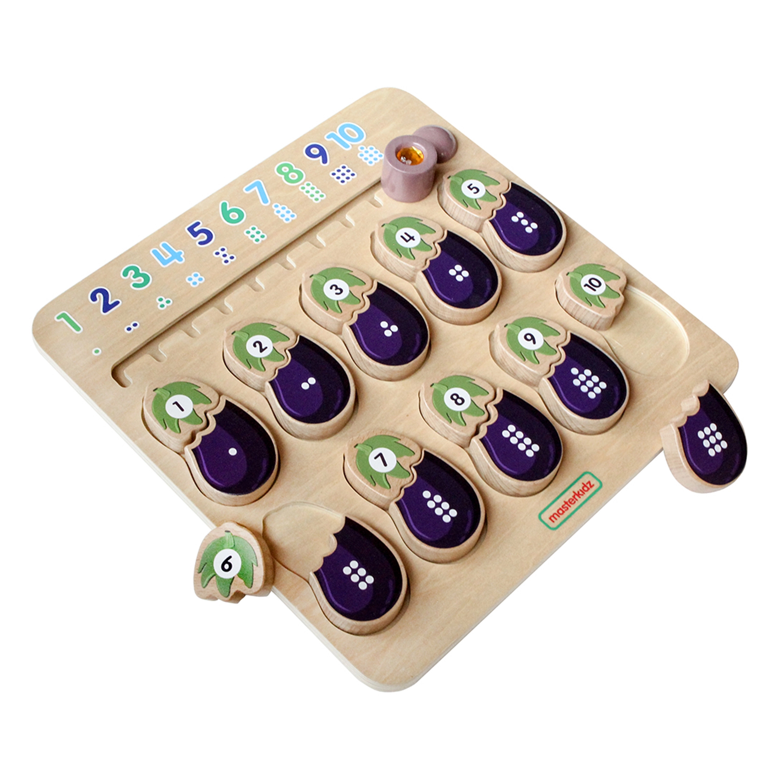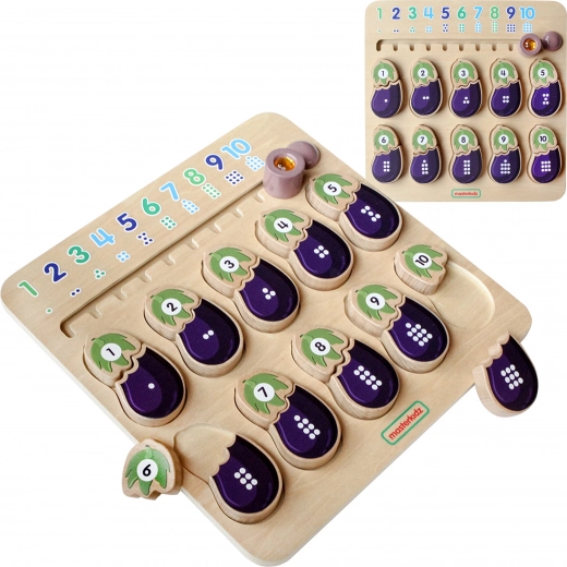 La lavagna educativa in legno del marchio MASTERKIDZ è progettata per aiutare i bambini a sviluppare i loro sensi. Questa lavagna li aiuta a familiarizzare con i numeri e i colori. I bambini devono abbinare correttamente le parti della melanzana – una parte rappresenta il numero e l’altra il corrispondente numero di puntini. In alto c’è uno slider con numeri e puntini nell’ordine corretto.