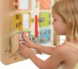 Questo robusto pannello in legno offre 6 diversi sportellini e meccanismi di chiusura, dalle semplici chiusure a scatto a ganci e catenacci più complessi. In modo ludico i bambini esercitano pazienza, destrezza delle dita e problem solving. Ogni apertura degli sportellini porta una ricompensa sotto forma di spazio in cui nascondere piccoli oggetti o cartoncini.