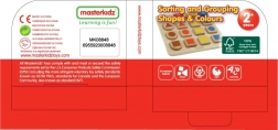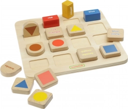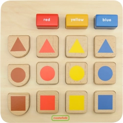 Questo strumento didattico in legno di alta qualità del marchio MASTERKIDZ sviluppa il riconoscimento delle forme (cerchio, quadrato, triangolo, ecc.) e dei colori (rosso, giallo, blu). I bambini inseriscono i pezzi nelle posizioni corrette in base al colore o alla forma e, allo stesso tempo, si familiarizzano con i termini inglesi stampati sui blocchi.