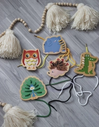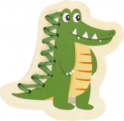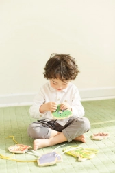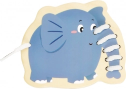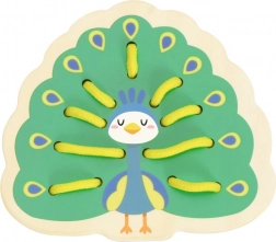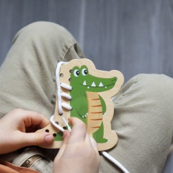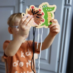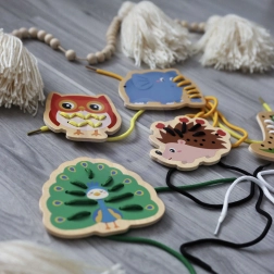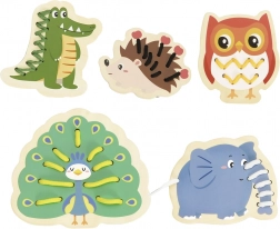 Questo set di infilatura in legno include cinque allegri animaletti – elefante, riccio, coccodrillo, pavone e gufo – e lacci colorati per intrecciarli. I bambini prima abbinano le parti come testa, zampe, orecchie o coda alla base dell’animaletto e poi le collegano con il laccio. Un’attività semplice che porta tanta gioia e allo stesso tempo rafforza in modo mirato abilità importanti per i prescolari.
