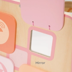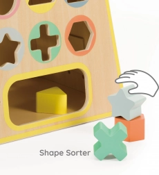 Grazie alle attività varie – dal sorter di forme e dalla pista per palline agli ingranaggi rotanti, agli slider e al labirinto di perline – i bambini allenano pensiero logico, pazienza e concentrazione. Gli sportellini segreti e lo specchietto stimolano la curiosità e il gioco del cucù.