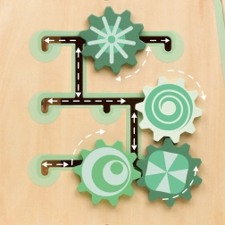 Il labirinto di perline, gli ingranaggi, gli slider e il sorter di forme catturano l’attenzione dei bambini e favoriscono concentrazione e logica.
