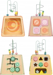 - 6 in 1 (sportellini segreti, ingranaggi, labirinto di perline, elementi scorrevoli, sorter di forme, pista per palline)