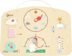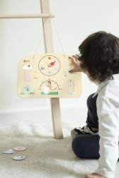 Questa tavola intelligente e divertente aiuta i bambini a capire cosa succede fuori dalla finestra. Con semplici rotazioni e spostamenti degli elementi, i bambini impostano da soli il meteo attuale e imparano a denominarlo correttamente. Grazie alla robusta struttura in legno e alle vernici sicure e atossiche, la tavola è ideale per la cameretta, l’asilo e i viaggi.