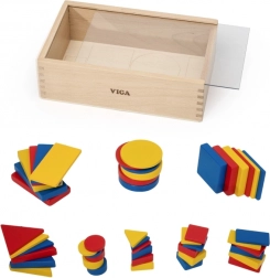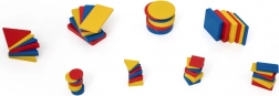 Un ricco set di forme geometriche in rosso, giallo e blu motiva i bambini a comporre schemi, classificare e riconoscere forme e colori.