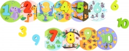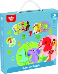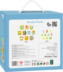I puzzle in legno Tooky Toy sono uno strumento ideale per l'apprendimento dei numeri e lo sviluppo delle abilità motorie nei bambini. Contiene 20 pezzi - 10 numeri e 10 carte con fori per inserire i numeri. Tutto è dipinto con colori non tossici, sicuri per i bambini e per l'ambiente.