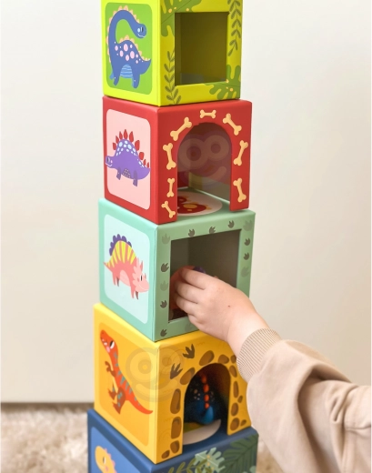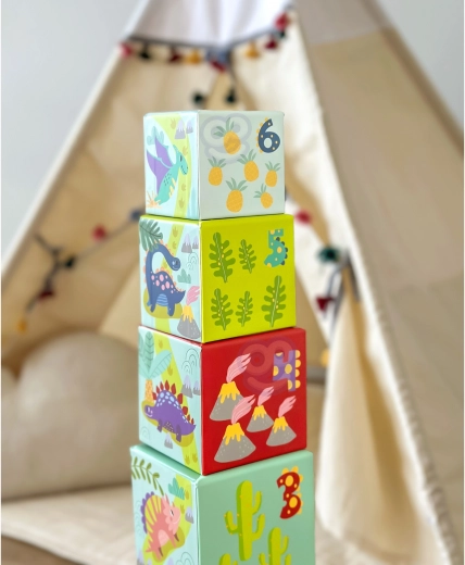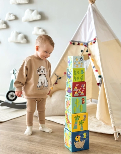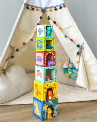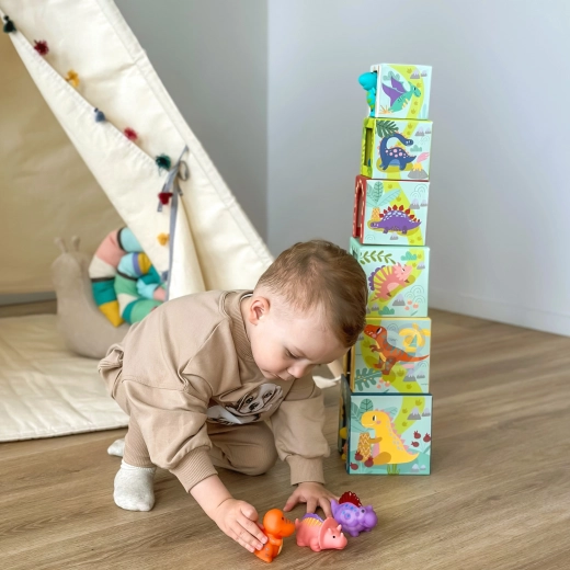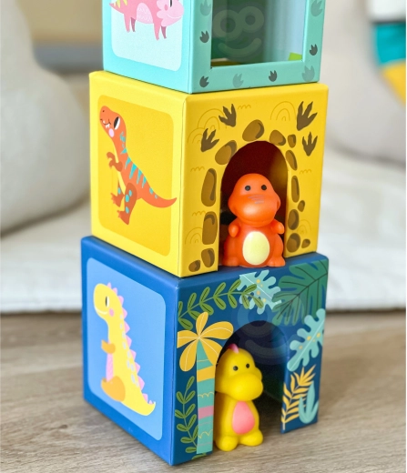 Il set TOOKY TOY combina cubi impilabili e a incastro con adorabili dinosauri. Il compito del bambino è abbinare la figurina corretta al cubo corrispondente in base al colore e all’illustrazione e inserirla all’interno della “casetta”. Grazie ai cubi leggeri e alle figurine morbide, la manipolazione è facile e sicura anche per i più piccoli.