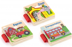 Pagine in legno con bordi arrotondati e superficie rifinita con colori atossici. Il robusto cordoncino rosso mantiene il libretto unito e facilita la sfogliatura.
