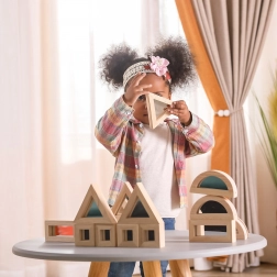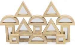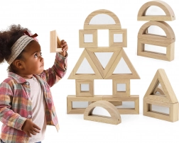 Set da 16 pezzi in rettangoli, quadrati, triangoli equilateri e semicerchi. Le superfici specchiate invitano all’esplorazione e rafforzano la consapevolezza di sé durante il gioco.
