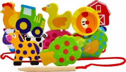 Scoprite la magia della fattoria con il set infilabile in legno WOOPIE GREEN. I bambini infilano gli elementi colorati – mucca, trattore, fienile, cavallino, pecorella, staccionata, gallina, gallo, balla di fieno e altri – sul cordino e allenano così la precisione delle dita e la coordinazione occhio–mano. Il legno naturale e i colori atossici garantiscono un gioco sicuro che allo stesso tempo rispetta l’ambiente.