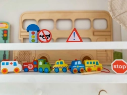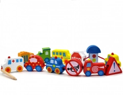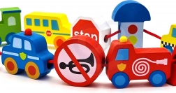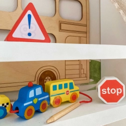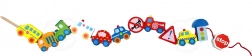 Colorati elementi in legno rappresentano auto, autobus, trattore, ambulanza e segnali stradali: i bambini scoprono in modo divertente il mondo del traffico.