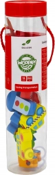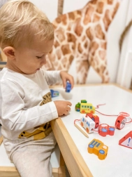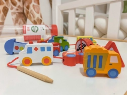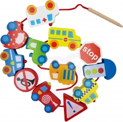 La confezione include 12 blocchetti di legno a tema veicoli e 1 laccio con bacchetta in legno per facilitare l’infilatura. Infilando gli elementi si possono creare proprie “colonne” o storie cittadine: dal camion dei pompieri alla volante della polizia fino all’autobus e ai segnali stradali.