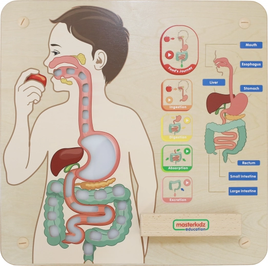 Scoprite come funziona il corpo umano con il pannello educativo Masterkidz. I bambini capiranno come l’apparato digerente elabora il cibo, conosceranno i principali organi e le diverse fasi della digestione grazie agli elementi luminosi. Il pannello stimola motricità, percezione sensoriale, coordinazione occhio–mano e curiosità; può essere utilizzato a parete, su tavolo o a terra.