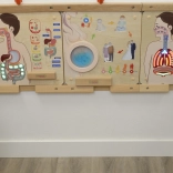 Il pannello è predisposto per il montaggio a parete in cornici speciali, ma funziona perfettamente anche senza cornice – su un tavolo o a terra. È ideale per scuole dell’infanzia, aree gioco e per l’apprendimento domestico in stile Montessori. Per gli effetti luminosi sono necessarie le batterie.