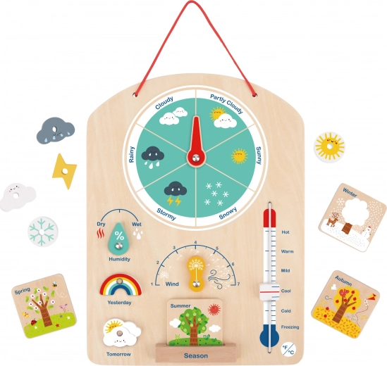 Con indicatori girevoli, i bambini registrano il meteo attuale, la temperatura e la stagione. Un ottimo rituale per parlare insieme al mattino e alla sera e arricchire il vocabolario.