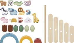 Il set include 29 pezzi, tra cui animali in legno e componenti di bilanciamento, che permettono la creazione di costruzioni uniche.