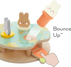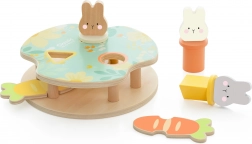 Il giocattolo include tre coniglietti colorati che il bambino inserisce nelle piattaforme secondo forma e colore. Premendo le carote, i coniglietti sbucano fuori!
