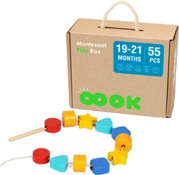 Set di infilatura composto da 11 blocchi di varie forme e un cordino. Supporta la motricità fine e la coordinazione mano-occhio.