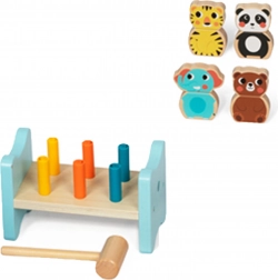 Giocattolo classico con una robusta struttura in legno, pioli colorati e un martello. Supporta lo sviluppo del pensiero logico e la distinzione dei colori.