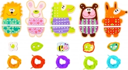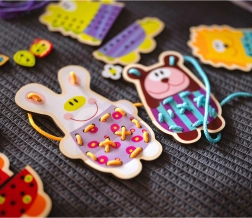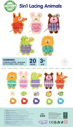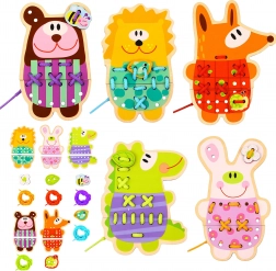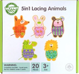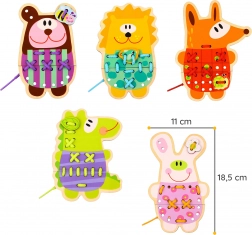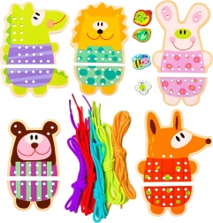 - 5 animali in legno da legare, 5 elementi da 'cucire', 5 corde colorate per infilare