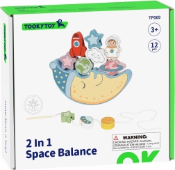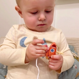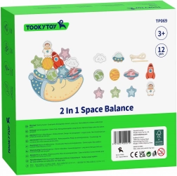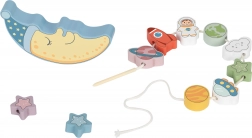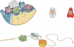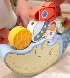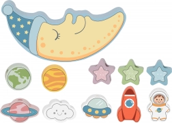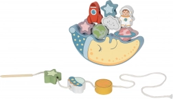 La prima parte del set è una sfida di bilanciamento: i bambini provano a posizionare 10 blocchi colorati – razzo, astronauta, stelle, UFO, pianeti e nuvola sorridente – sul volto dormiente della luna, cercando di prevenire il crollo della costruzione. È una grande opportunità per esercitare precisione e pazienza.