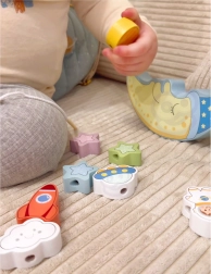 La seconda parte offre un gioco di infilatura creativo: i blocchi possono essere infilati usando un ago di legno e filo, il che aiuta a sviluppare abilità motorie fini e coordinazione mano-occhio.
