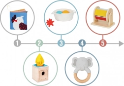 Scatola Didattica Tooky Toy offre ai bambini di età 5-6 mesi l'opportunità di apprendimento divertente e stimolante. Contiene sei giocattoli sensoriali e didattici che supportano lo sviluppo psicomotorio sano e stimolano i sensi del vostro bambino.
