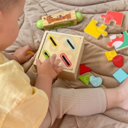 Questo set Montessori in legno del marchio TOOKY TOY è progettato su misura per bambini di 22–24 mesi. Grazie alla combinazione studiata di attività, sviluppa i sensi (vista, tatto, udito), rafforza lo sviluppo psicomotorio e propone un apprendimento divertente attraverso il gioco. Include anche una guida per i genitori con consigli su quando e come introdurre i singoli giochi.