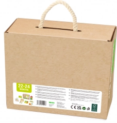 Scatola resistente con manico in corda e guida per i genitori per introdurre le attività al momento giusto e con suggerimenti per divertirsi al massimo.