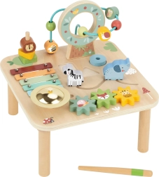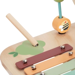 Il tavolino si ispira ai principi Montessori: il bambino esplora in autonomia, classifica, costruisce e crea suoni. In questo modo sviluppa motricità fine, logica e percezione uditiva e visiva. Tutti i componenti sono adatti alle mani dei più piccoli e dipinti con colori innocui.